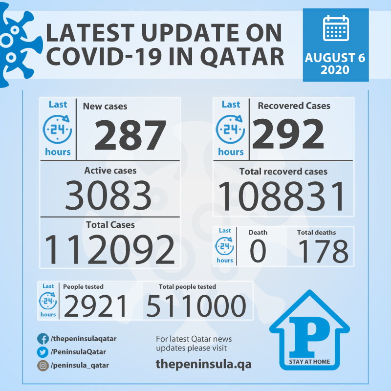 Ministry of Public Health today recorded 287 new cases of coronavirus (COVID-19) and 292 people recovered from the virus in the last 24 hours, bringing the total number of people recovered in Qatar to 108,831.