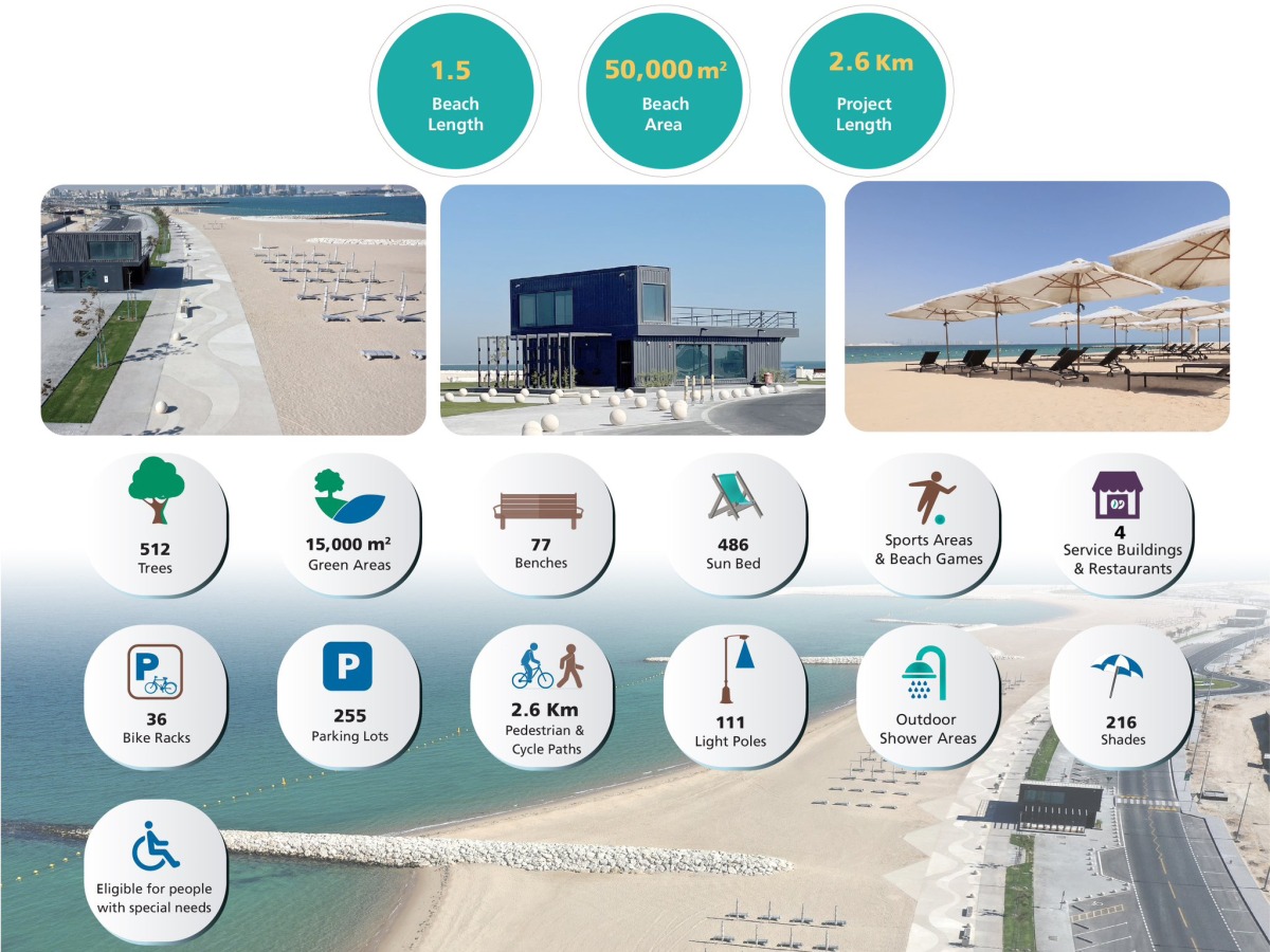 Al Mulla added: The beach has a unique design, as some of its elements were executed from recyclable materials, which contributes to preserving and sustaining the environment.
