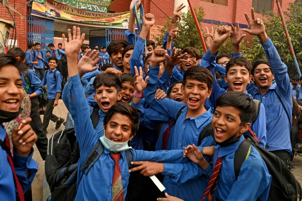 Students gesture as they leave after attending their school in Lahore on November 6, 2024, as government authorities ordered closing all higher secondary schools over soaring pollution levels. Photo by Arif ALI / AFP
