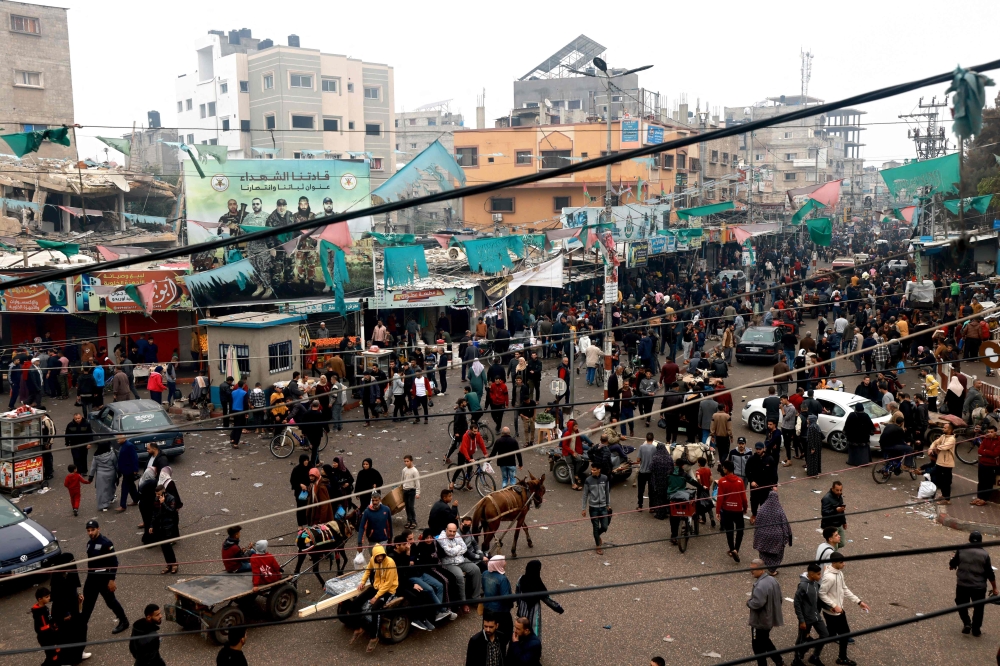 Palestinians, including many displaced from other areas in the Gaza Strip, walk through a main square in Rafah near the border with Egypt on December 5, 2023. Photo by MOHAMMED ABED / AFP