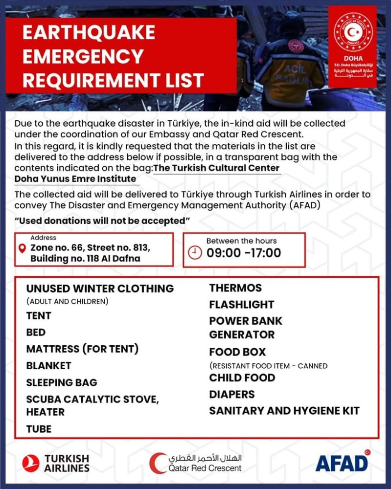 Doha: The Yunus Emre Turkish Cultural Center in Doha has launched a drive to collect in-kind donations in aid of victims of the earthquake in Türkiye.