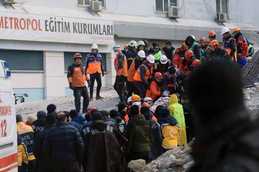 Rescuers evacuate a victim retrieved in the rubble of collapsed buldings in Gaziantep, close to the quake's epicentre, a day after a 7.8-magnitude earthquake struck the country's southeast, on February 7, 2023. (Photo by Zein Al RIFAI / AFP)