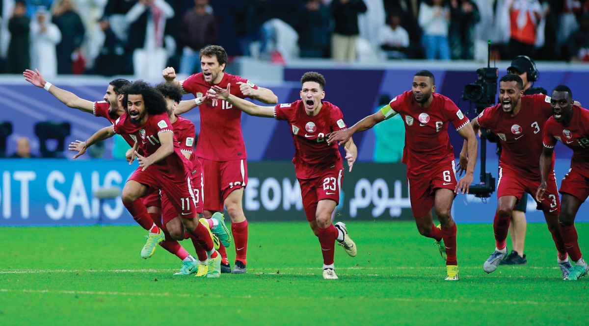 Qatar players celebrate after winning the shootout against Uzbekistan.