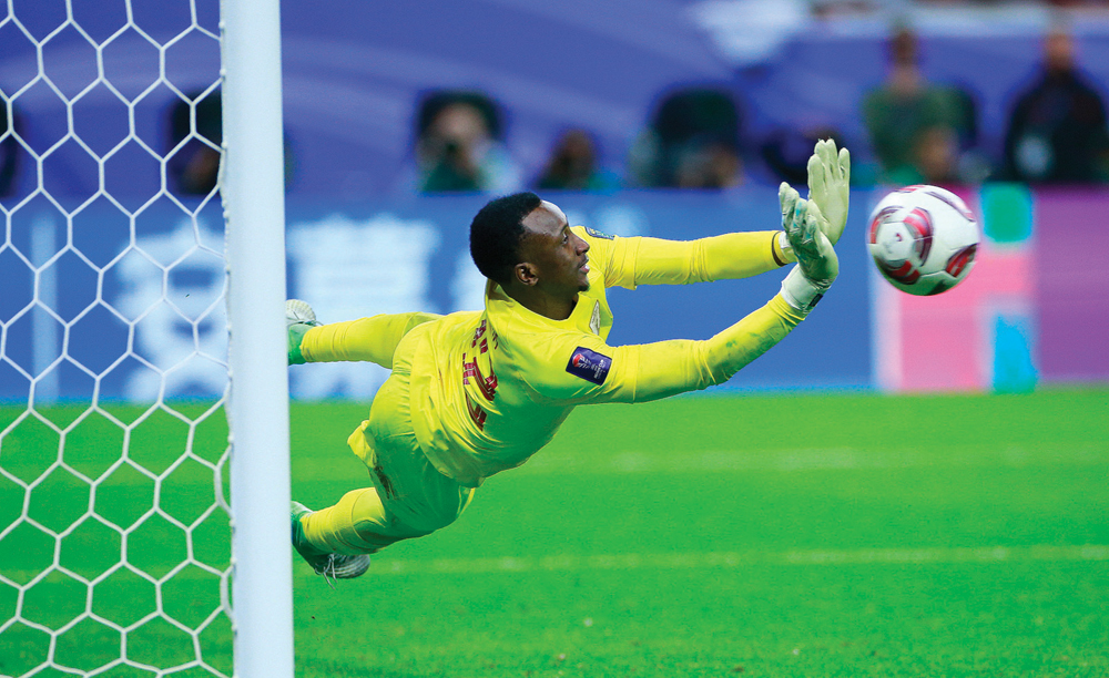 Qatar goalkeeper Meshaal Barsham blocks a penalty during quarter-final against Uzbekistan.