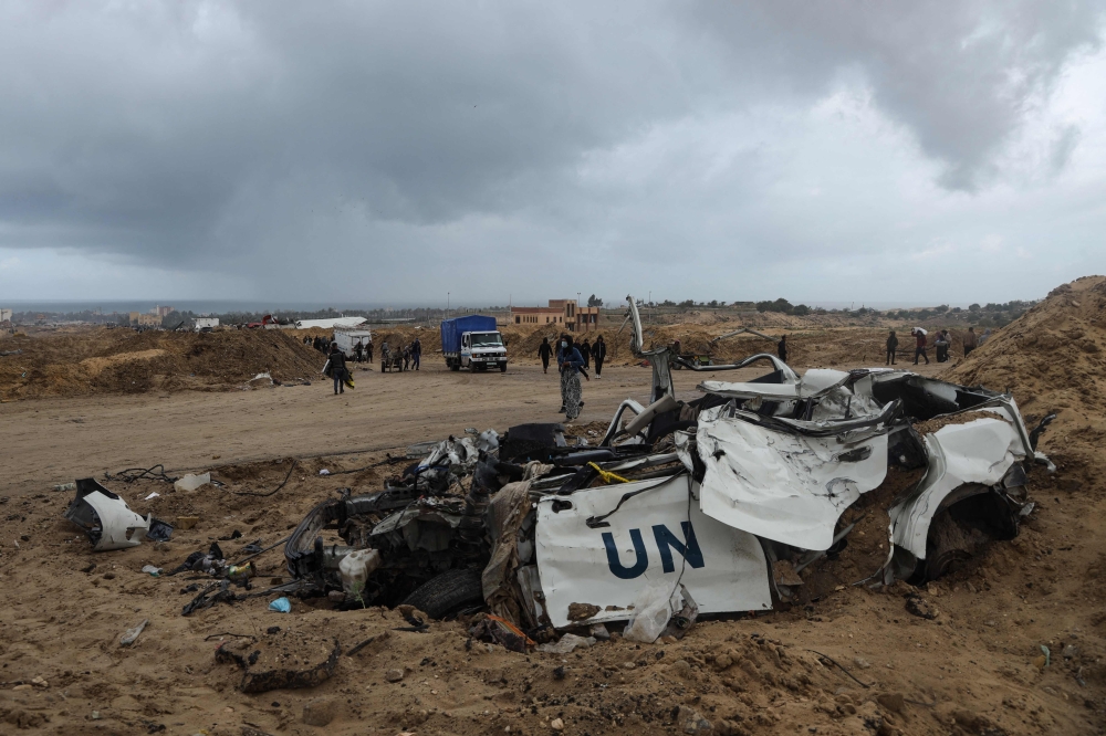 Palestinians walk past a destroyed UN car as they flee Khan Yunis in the southern Gaza Strip on March 7, 2024, amid ongoing battles between Israel and the Palestinian militant group Hamas. (Photo by AFP)
