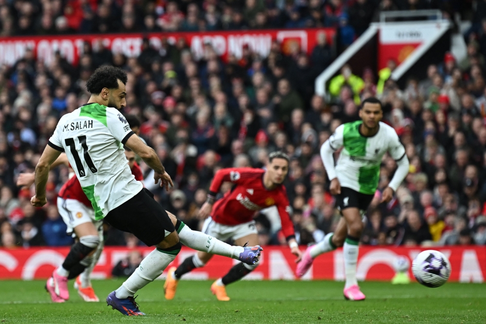 Liverpool's Egyptian striker #11 Mohamed Salah scores their second goal from the penalty spot during the English Premier League football match between Manchester United and Liverpool at Old Trafford in Manchester, north west England, on April 7, 2024. (Photo by Paul ELLIS / AFP)