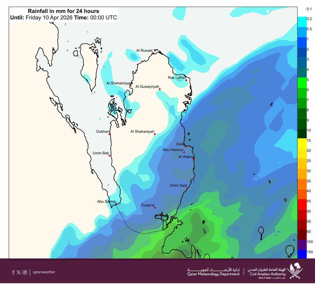 The Qatar Meteorology Department said that conditions are expected to be partly cloudy to cloudy, with chances of scattered rain, which maybe thundery at times, from Thursday April 9, 2026.