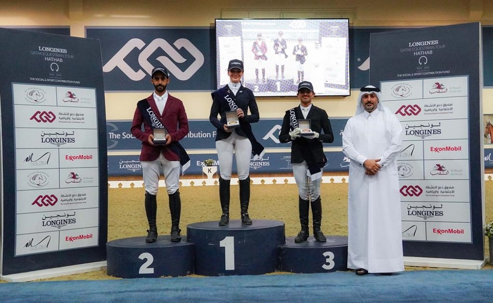 Azade APA Triolet, winner of Level 2, poses on the podium along with runner-up Khalid Sanad Al Nuaimi and Jassim Mohammed Al Fahd Al Kuwari, who clinched third position.
