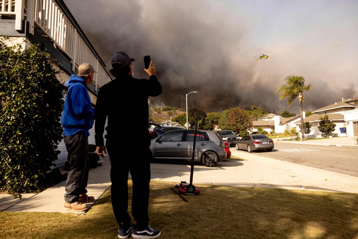Residents watch a firefighting helicopter flying over the burning hills as the Santa Ana wind-fed Mountain fire scorches acres, in Camarillo, California, on November 6, 2024. Photo by ETIENNE LAURENT / AFP