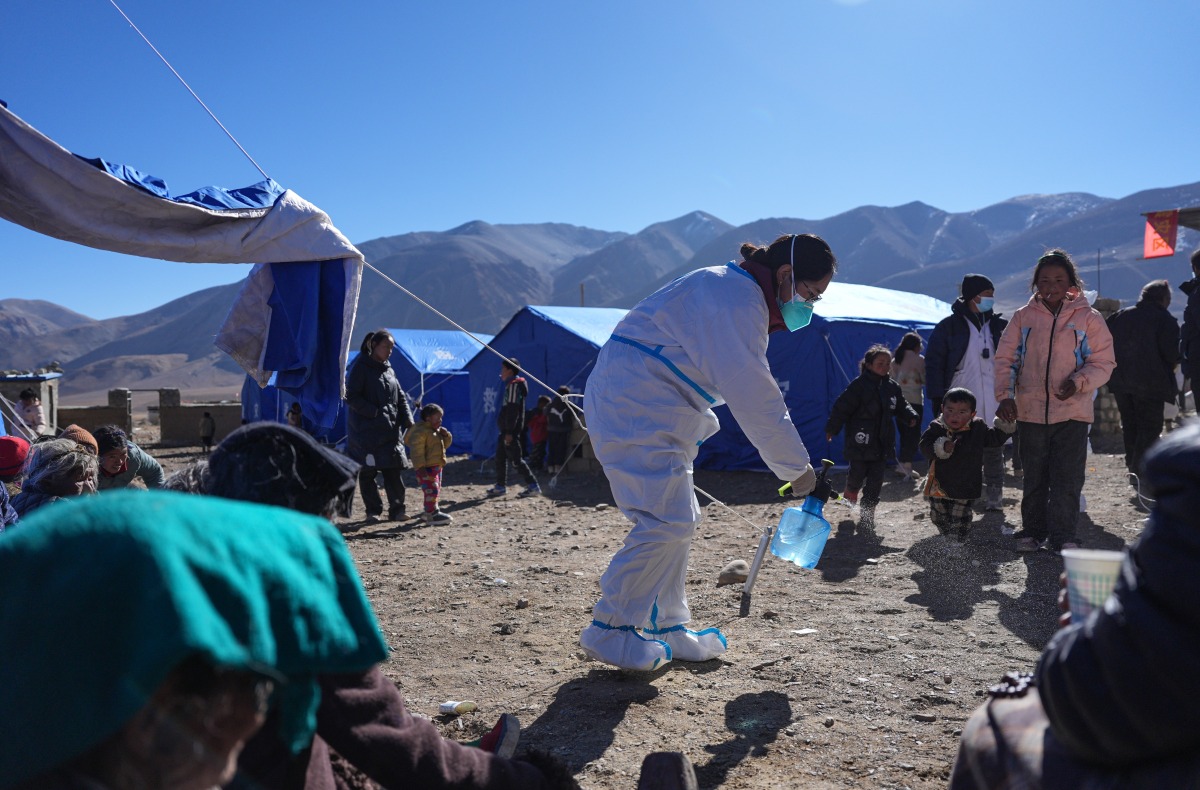 A medical worker conducts disinfection at a relocation site in a village of Tsogo Township, Dingri County, in Xigaze City, southwest China's Xizang Autonomous Region, Jan. 8, 2025. (Xinhua/Jigme Dorje)