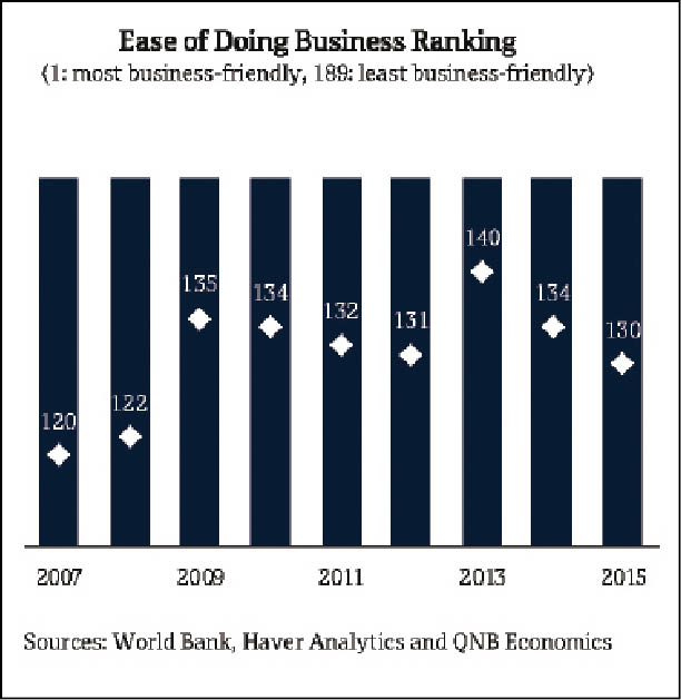 However, two decades after the 1991 reforms, the Indian economy was crippled by supply bottlenecks in the form of weak transport infrastructure and power shortages. India’s ranking in the World Bank’s Ease of Doing Business Index deteriorated from 120 out of 189 in 2007 to 140 in 2013, lagging behind Sri Lanka, Nepal, Bhutan and Pakistan. The persistent inflation problem, a result of supply bottlenecks, was further exacerbated by government policies aimed at increasing rural wages and easy monetary policy.