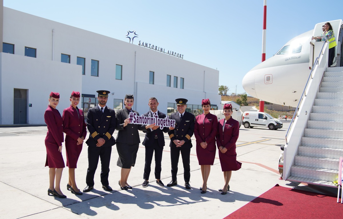 The inaugural flight from Doha was operated by Qatari Captain Abdulaziz Al Kaabi and Greek Captain Andrew Evlambides, in honour of the first flight to Santorini. The island destination joins Athens and Mykonos to become the third Greek gateway to be served by the national carrier of the State of Qatar.