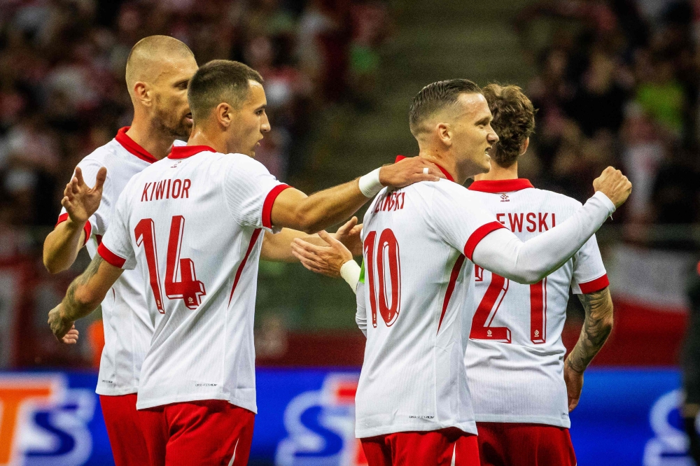 Poland's midfielder #10 Piotr Zielinski celebrates scoring his team's second goal with his team mates during the International friendly football match between Poland and Ukraine in Warsaw, Poland, on June 7, 2024. (Photo by Wojtek Radwanski / AFP)