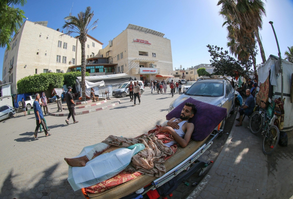 A wounded man lies on a gurney in the shade, out side the Aqsa Martyrs hospital in Deir el-Balah, in the central Gaza Strip on June 7, 2024. (Photo by Bashar Taleb / AFP)