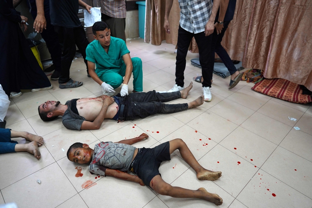 A boy and man in critical condition following Israeli bombardment, lie on the floor of the al-Aqsa Martyrs Hospital in Deir al-Balah, in the central Gaza Strip, on June 8, 2024. Photo by Bashar TALEB / AFP.