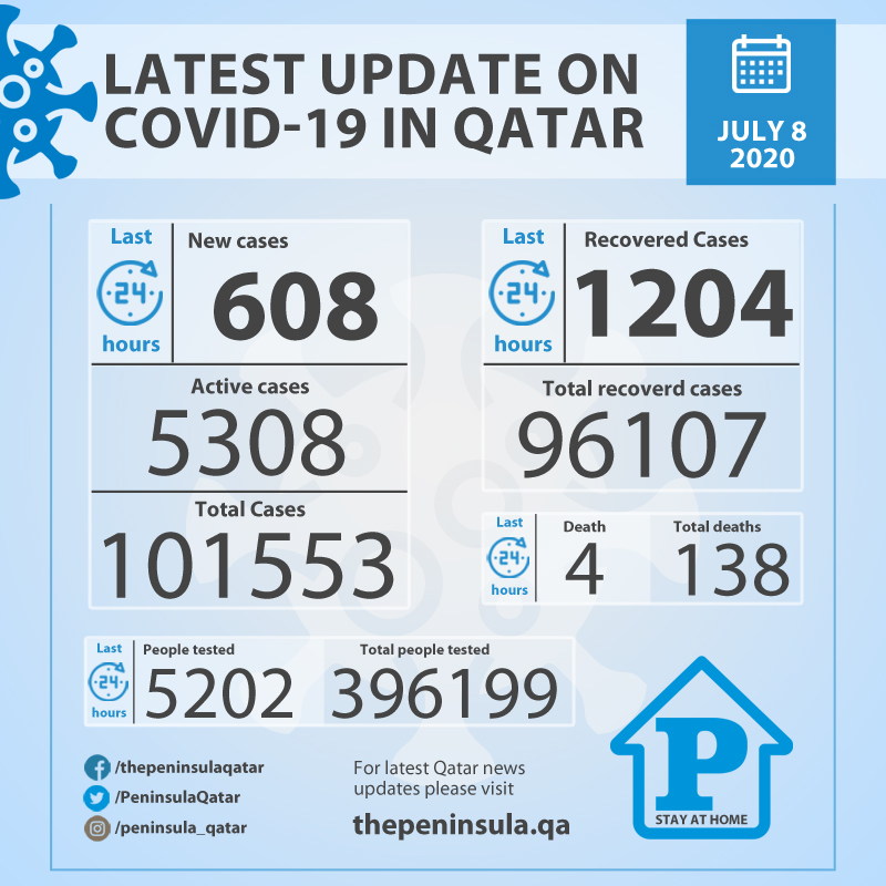 Ministry of Public Health today recorded 608 new cases of coronavirus (COVID-19) and 1204 people recovered from the virus in the last 24 hours, bringing the total number of people recovered in Qatar to 96107. The Ministry also announced four deaths due to Covid-19.