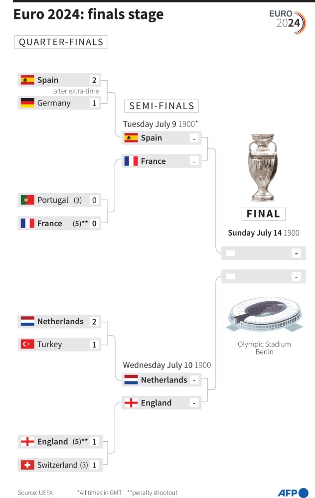 Dusseldorf: Three weeks down and with one week to go, Euro 2024 has reached the semi-final stage and is getting ready for two heavyweight ties as France take on Spain and England meet the Netherlands.