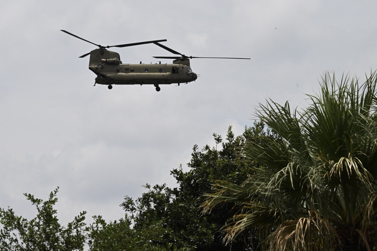 A helicopter flies overhead looking for missing people in Kerrville, Texas, on July 7, 2025, following severe flash flooding that occured during the July 4 holiday weekend. Photo by Ronaldo Schemidt/AFP