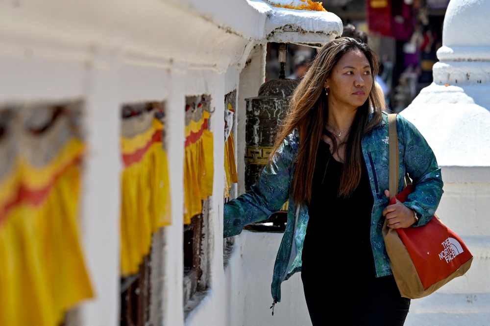 This photo taken on September 19, 2024 shows Dawa Yangzum Sherpa spinning prayer wheels at the Boudhanath Stupa in Kathmandu. (Photo by Prakash Mathema / AFP)