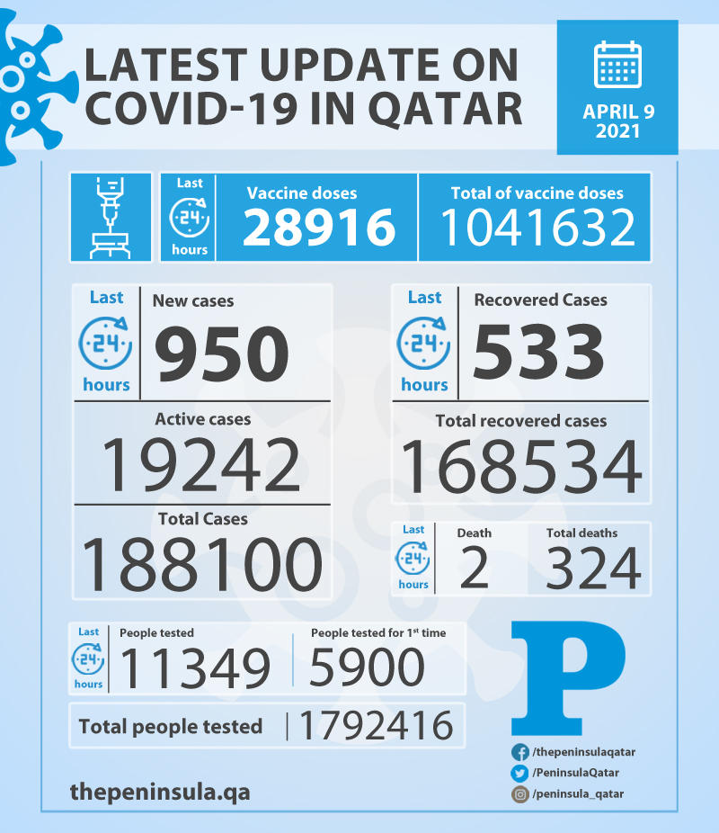 Doha: Ministry of Public Health (MoPH) today reported 950 new cases of coronavirus (Covid-19) and 533 people recovered from the virus in the last 24 hours, bringing the total number of people recovered in Qatar to 168,534.