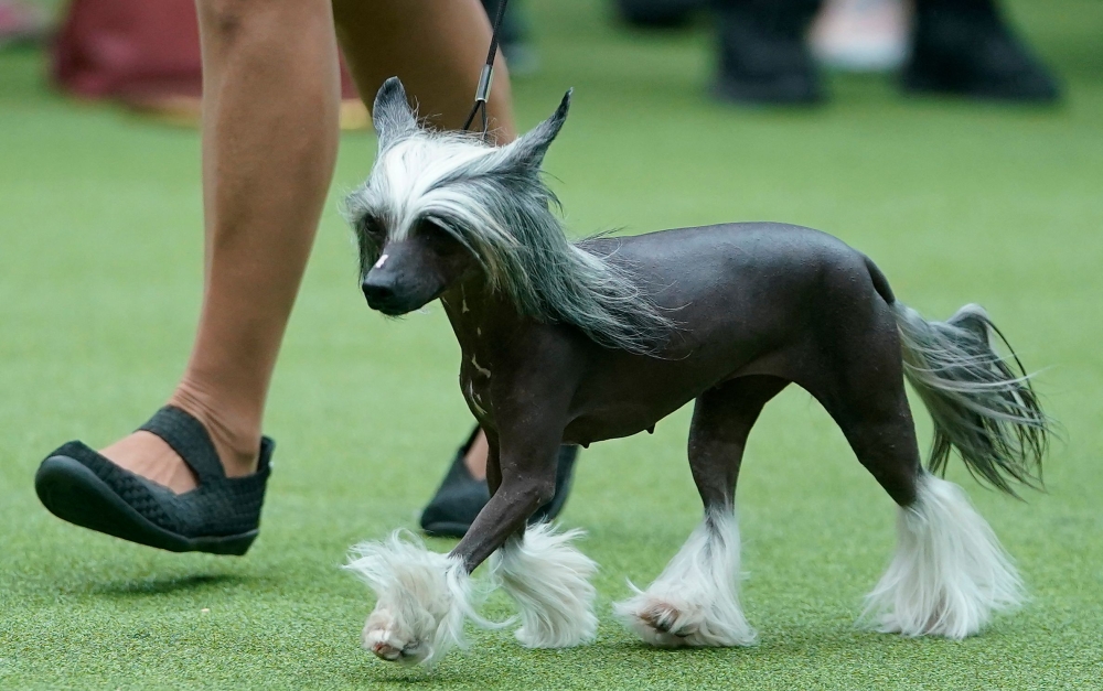 A Chinese Crested in the judging area during the Annual Westminster Kennel Club dog Show judging of Hound, Toy, Non-Sporting and Herding breeds and Junior Showmanship at the Arthur Ashe Stadium in New York City on May 8, 2023. (Photo by TIMOTHY A. CLARY / AFP)