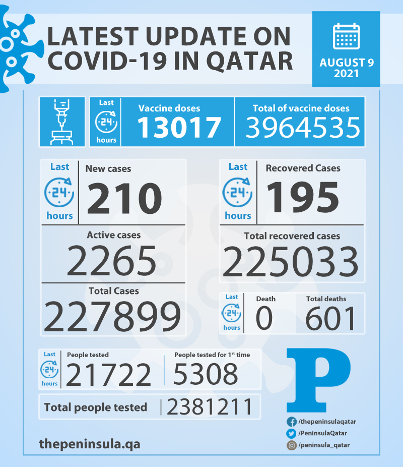 The total number of positive Covid-19 cases recorded in Qatar till now is 227,899 and there are 2,265 active cases under treatment.