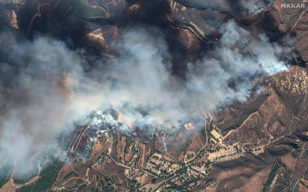 This handout satellite picture courtesy of Maxar Technologies shows an overview of the fire line and burning areas near Moorpark, California, November 7, 2024. (Photo by Satellite image ゥ2024 Maxar Technologies / AFP)