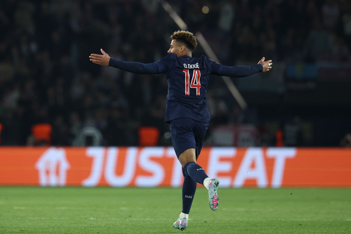 Paris Saint-Germain's French midfielder #14 Desire Doue celebrates after scoring his team's first goal during the UEFA Champions League Quarter final first leg football match between Paris Saint-Germain (FRA) and Aston Villa (ENG) at the Parc des Princes stadium in Paris on April 9, 2025. (Photo by FRANCK FIFE / AFP)