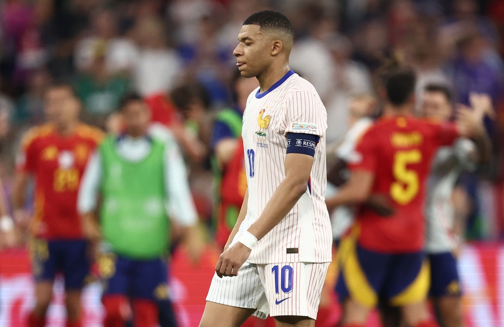 France's forward #10 Kylian Mbappe reacts after losing the UEFA Euro 2024 semi-final football match between Spain and France at the Munich Football Arena in Munich on July 9, 2024. (Photo by FRANCK FIFE / AFP)