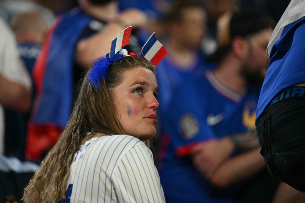 A France fan reacts at the end of the UEFA Euro 2024 semi-final football match between Spain and France at the Munich Football Arena in Munich on July 9, 2024. (Photo by Fabrice COFFRINI / AFP)