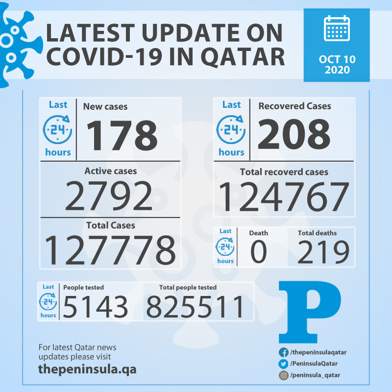 Doha: Ministry of Public Health (MoPH) today recorded 178 new cases of coronavirus (COVID-19) and 208 people recovered from the virus in the last 24 hours, bringing the total number of people recovered in Qatar to 124,767.