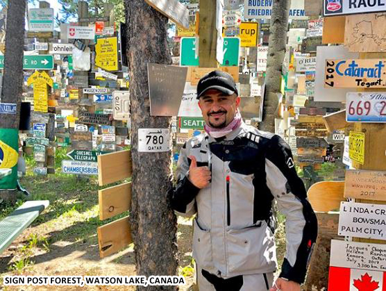 His BMW GS motorcycle with the Qatari numberplate '780' has been to many different corners of the world and in this trip has left a permanent imprint at Sign Board Forest, Watson Lake in Canada.