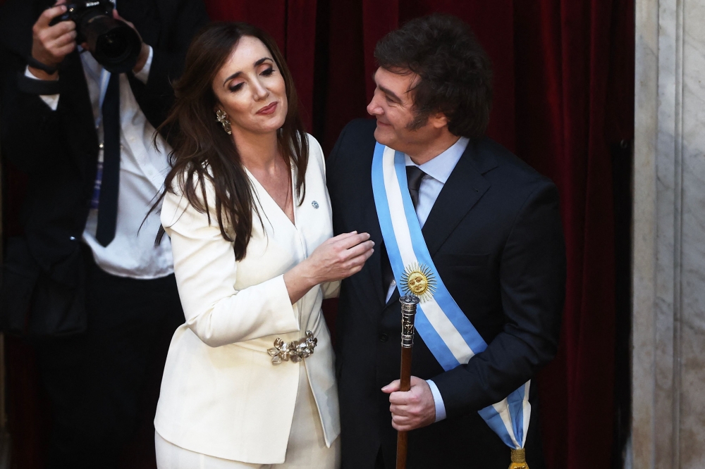 Argentina's new president Javier Milei (R) is pictured next to his vice-president Victoria Villarruel after receiving the presidential sash and baton from outgoing president Alberto Fernandez (out of frame) during his inauguration ceremony at the Congress in Buenos Aires on December 10, 2023. (Photo by ALEJANDRO PAGNI / AFP)