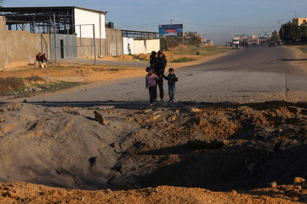 Palestinians fleeing Khan Yunis in southern Gaza Strip further south toward Rafah, stare at a crater caused by Israeli bombing on the Salah Al-Din road, on December 10, 2023. Photo by SAID KHATIB / AFP