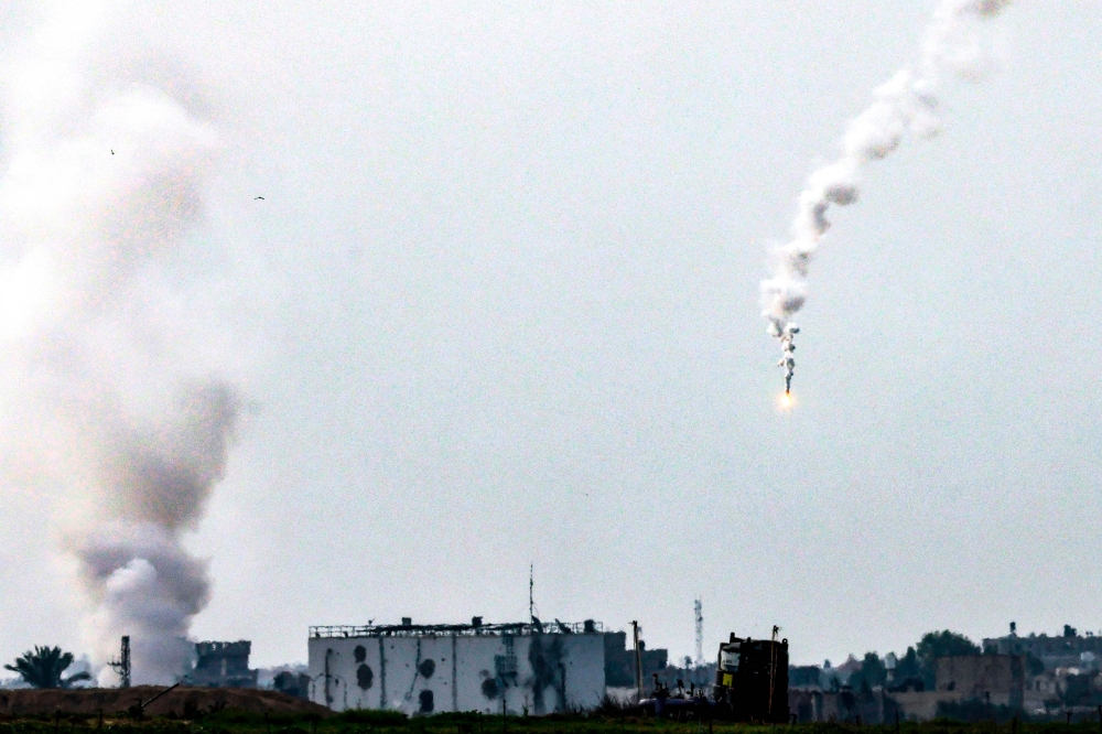 A picture shows smoke rising during bombardments as well as a flare fired by Israeli troops falling on Khan Yunis in the southern Gaza Strip on December 10, 2023. (Photo by Menahem Kahana / AFP)