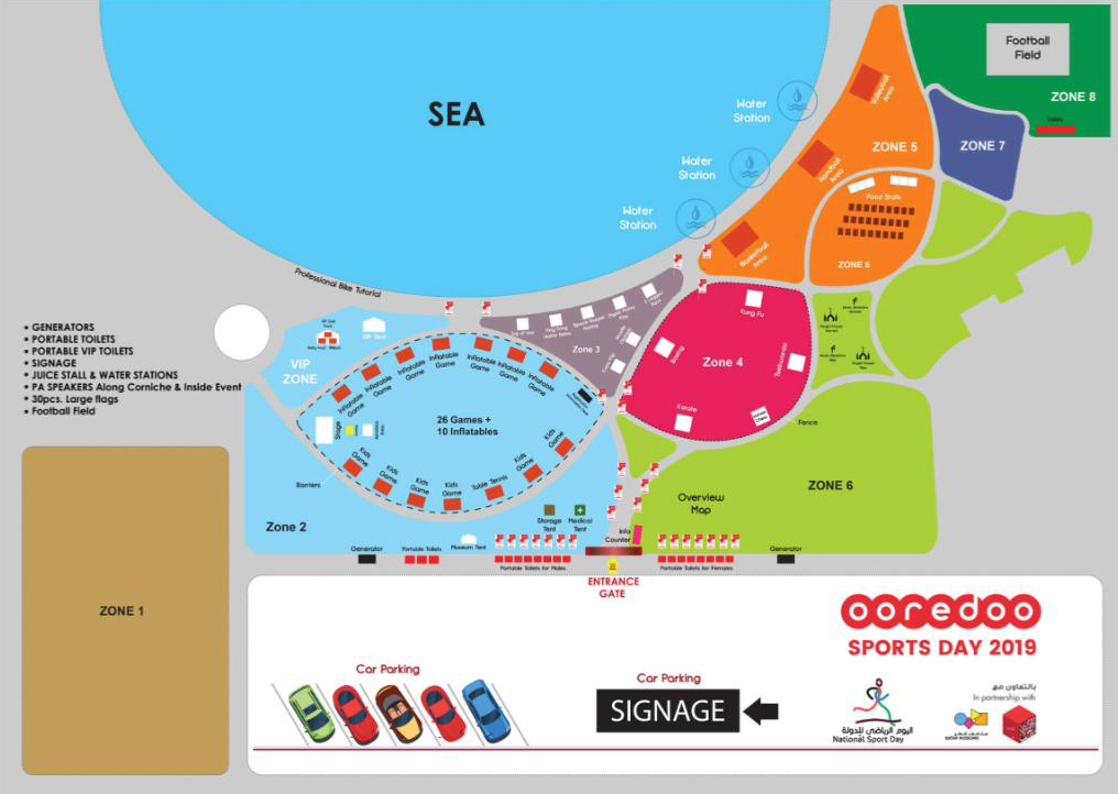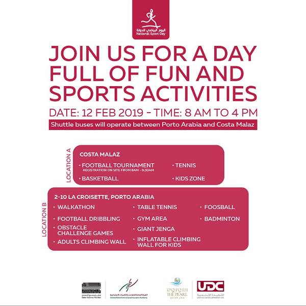 Pearl Qatar is another venue that has lined up activities from 8am to 4pm at two different spots in the island. Football, Basketball, Tennis and Kids zone will be at Costa Malaz. Meanwhile, walkathon, football dribbling, Obstacle challenge games, Adult climbing wall, Table Tennis, Gym Ara, Giant Jenga, Inflatable climbing wall for kids, Foosball and Badminton at La Croisette in Porto Arabia. Shuttle buses will operate between Porto Arabia and Costa Malaz.