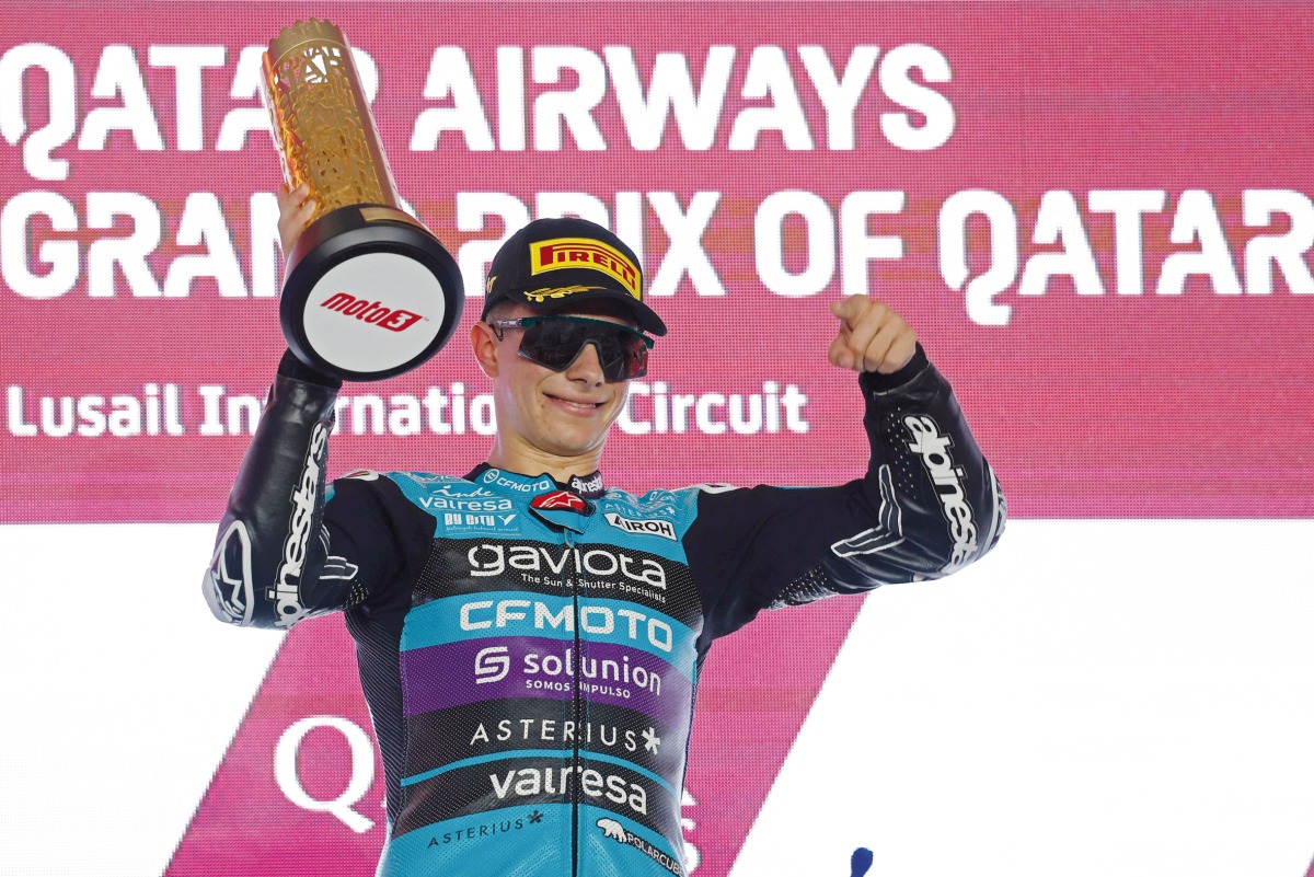 Moto3 winner, CFMoto Aspar Team's Colombian rider David Alonso on the podium. AFP