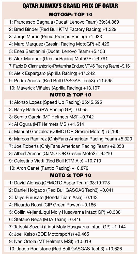 The reigning double world champion Francesco Bagnaia precisely did the same as he delivered a flawless performance to start his title defence with an emphatic victory in the Qatar Airways Grand Prix of Qatar.