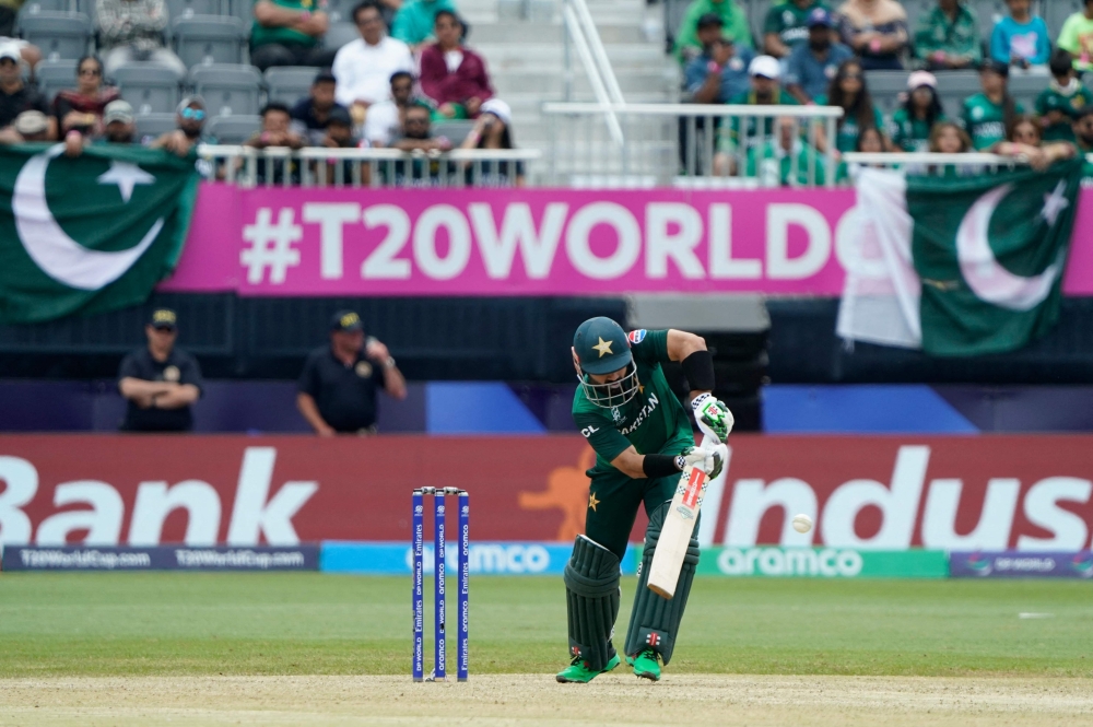 Pakistan's Mohammad Rizwan plays a shot during the ICC men's Twenty20 World Cup 2024 group A cricket match between Pakistan and Canada at Nassau County International Cricket Stadium in East Meadow, New York on June 11, 2024. (Photo by Timothy A. Clary / AFP)