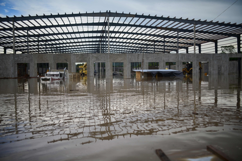 A truck remains partially submerged on a flooded street after heavy rains in Poza Rica, Mexico on October 10, 2025. (Photo by Marco Antonio Perez / AFP)