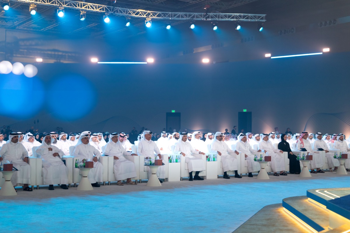 Shura Council Speaker H E Hassan bin Abdullah Al-Ghanim, Prime Minister and Minister of Foreign Affairs H E Sheikh Mohammed bin Abdulrahman bin Jassim Al-Thani, and Their Excellencies the Ministers with other dignitaries and participants during the ceremony.