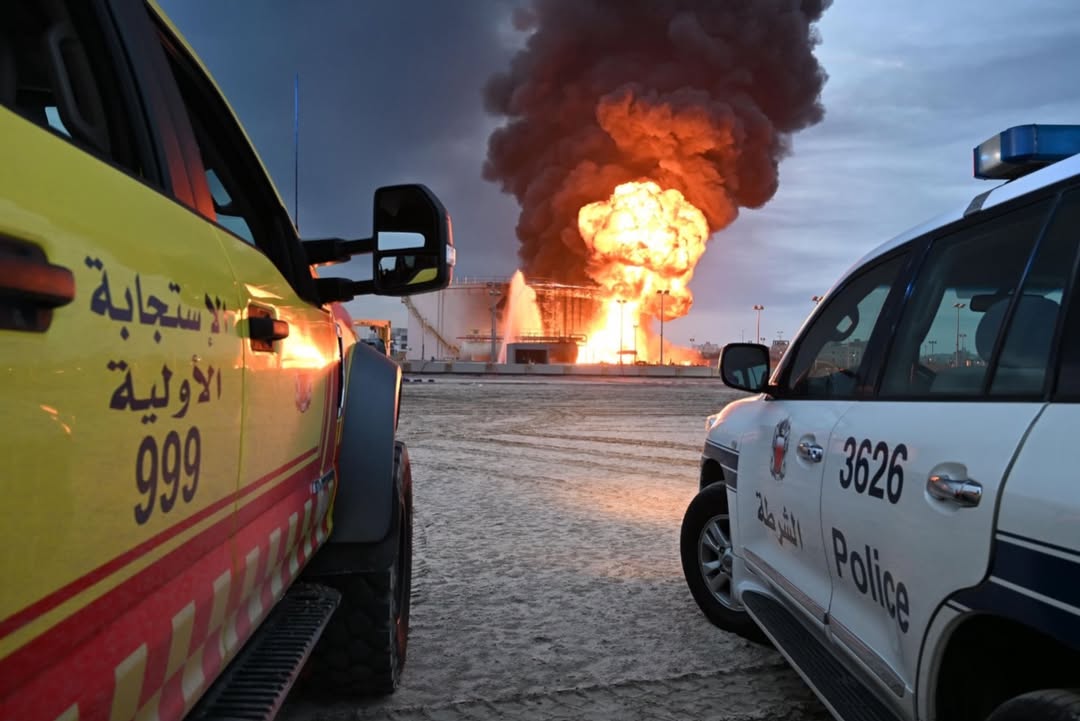 Doha, Qatar: Sharing photos from fire that broke out in the fuel tanks of one of the facilities in Muharraq Governorate, Bahrain's Ministry of Interior said that the Civil Defence teams are continuing their efforts to control the fire.