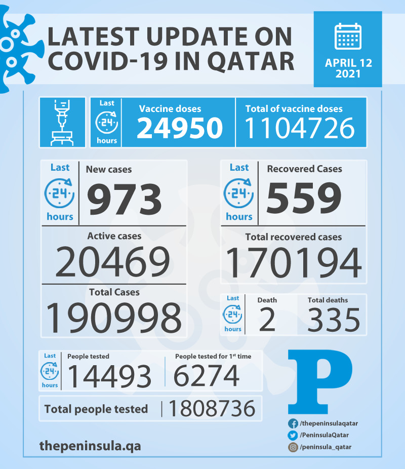 Doha: Ministry of Public Health (MoPH) today reported 973 new cases of coronavirus (Covid-19) and 559 people recovered from the virus in the last 24 hours, bringing the total number of people recovered in Qatar to 170,194.