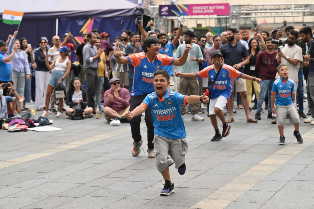 Young fans celebrate during the ICC men's Twenty20 (T20) World Cup 2024 match between India and USA at a viewing party at The Oculus World Trade Center on June 12, 2024 in New York. (Photo by Angela Weiss / AFP)