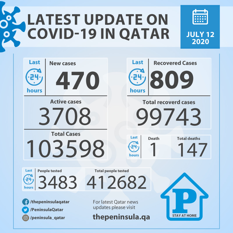 Ministry of Public Health today recorded 470 new cases of coronavirus (COVID-19) and 809 people recovered from the virus in the last 24 hours, bringing the total number of people recovered in Qatar to 99743. The Ministry also announced one death due to Covid-19.
