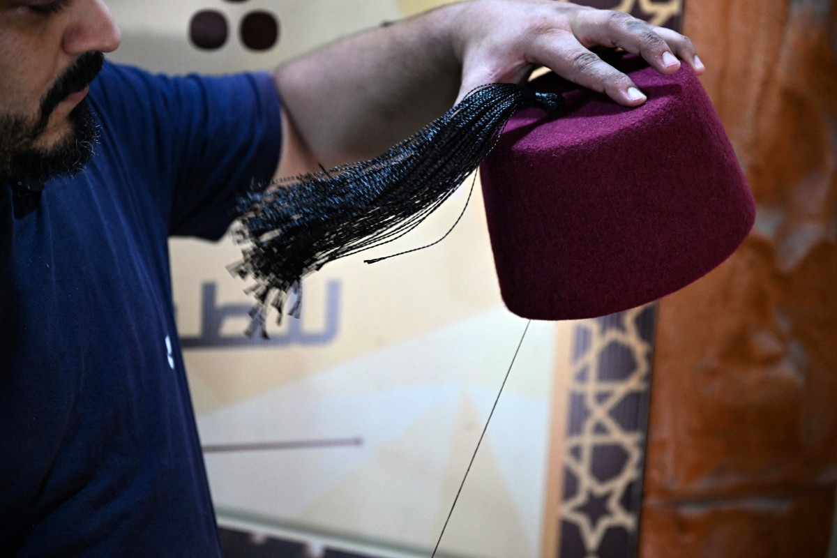 With a thimble on one finger, Shaar, 38, cuts, sews and carefully assembles the pieces of the conical, flat-topped felt hat also known as a fez, attaching a tassel to the top.
