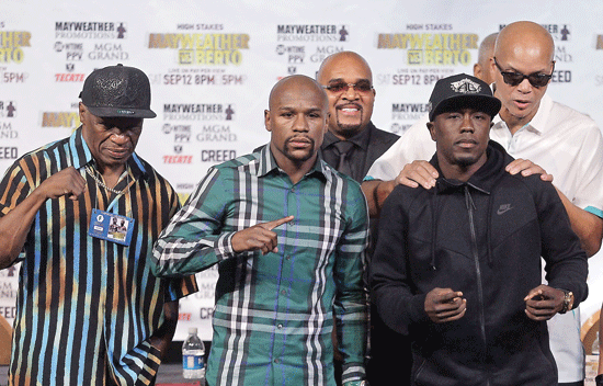 Trainer Floyd Mayweather Sr. (left) his son, boxer Floyd Mayweather Jr. (second left), CEO of Mayweather Promotions Leonard Ellerbe (centre), boxer Andre Berto (second right) and his trainer Virgil Hunter pose during a press conference on Wednesday at the MGM Grand in Las Vegas.
