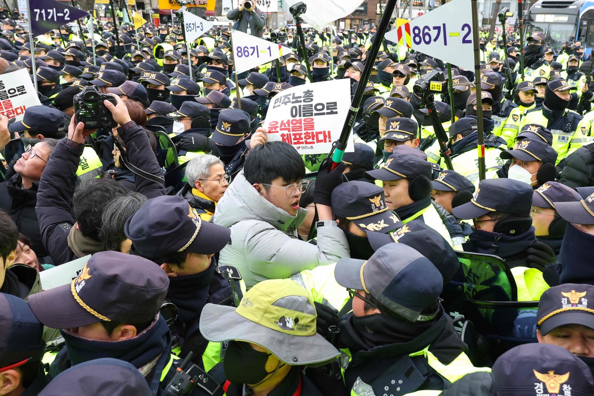 Police (bottom) attempt to block protesters calling for the impeachment of South Korea President Yoon Suk Yeol and the dissolution of the People's Power Party from marching towards the presidential office in Seoul on December 12, 2024. Photo by YONHAP / AFP
