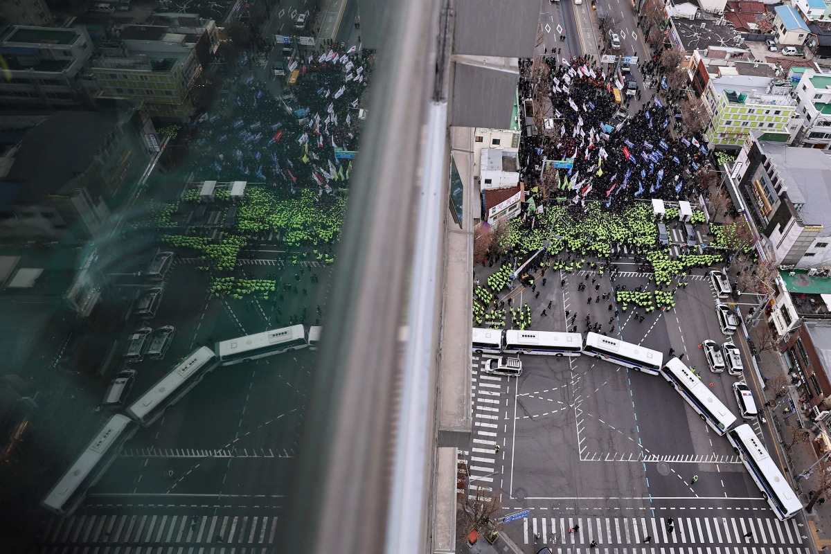 Police use buses as barricades in an attempt to block protesters calling for the impeachment of South Korea President Yoon Suk Yeol and the dissolution of the People's Power Party from marching towards the presidential office in Seoul on December 12, 2024. Photo by YONHAP / AFP
