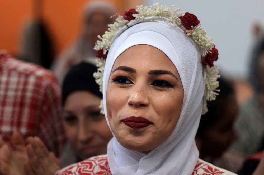 Rafah, Palestinian Territories: Surrounded by family and friends, clapping and cheering, Gaza woman Afnan Jibril beams a brilliant smile on her wedding day, determined to celebrate even as war rages.